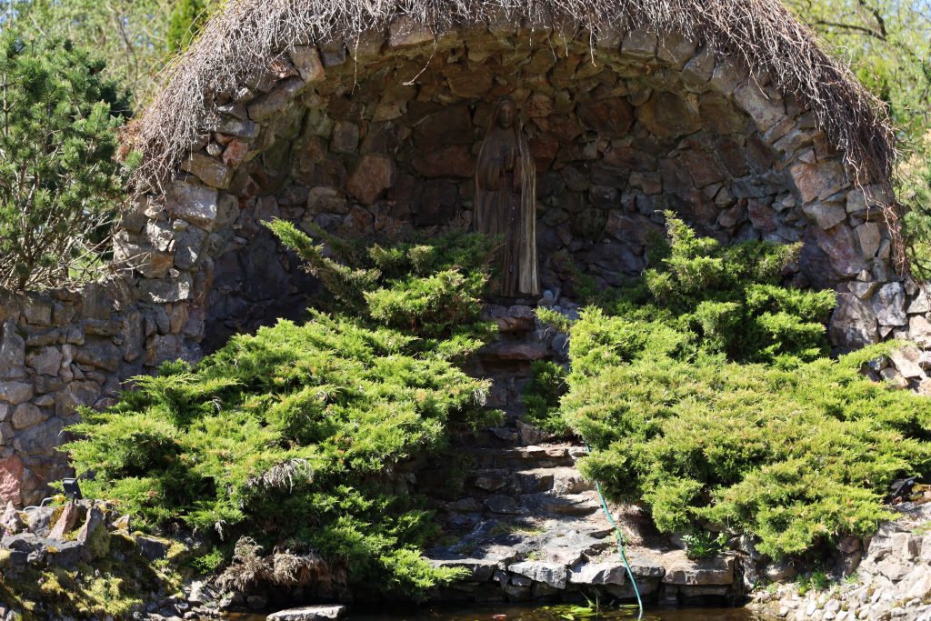– W miejscu, w którym stał ołtarz starego, drewnianego kościoła postanowiłem wybudować grotę. Umieściłem w niej figurę Matki Boskiej. Wokół groty wykopano sadzawkę, w której pływają rybki –opowiada.