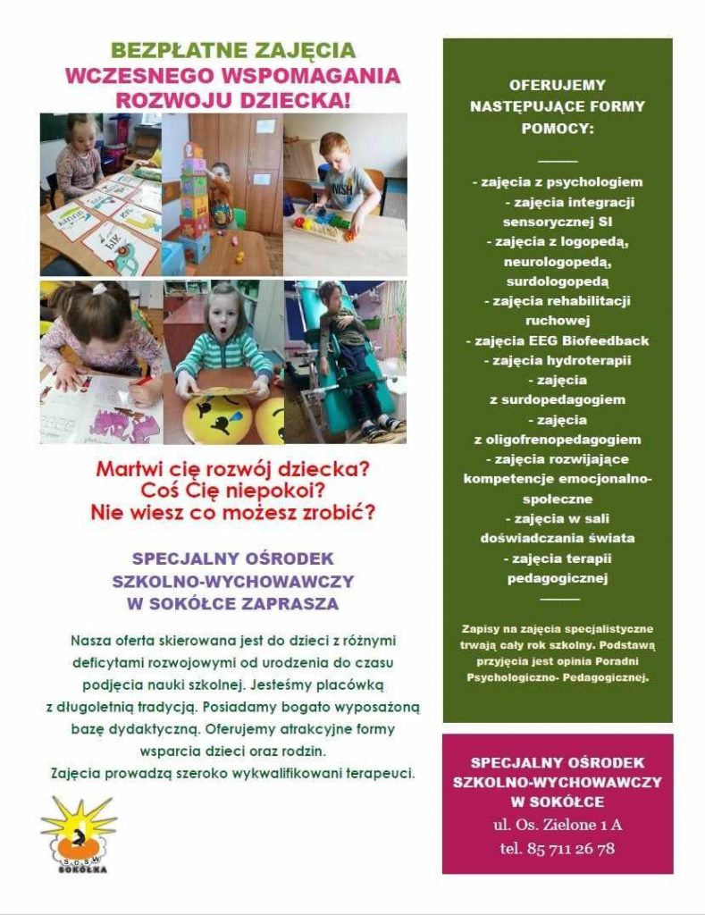 Specjalny Ośrodek Szkolno-Wychowawczy zaprasza na zajęcia wczesnego wspomagania rozwoju dziecka.