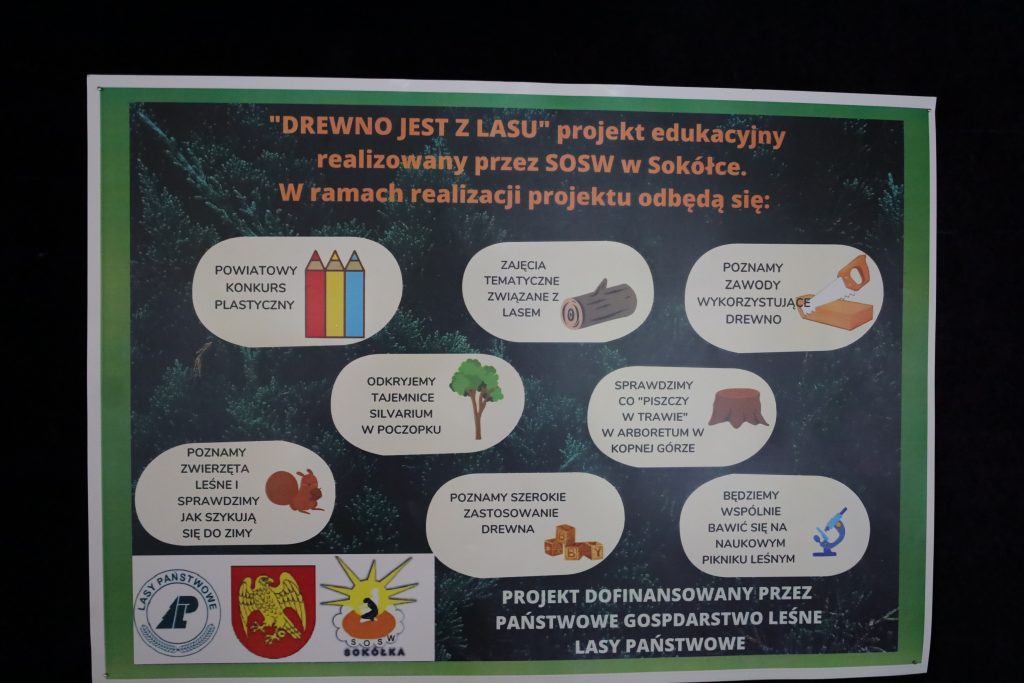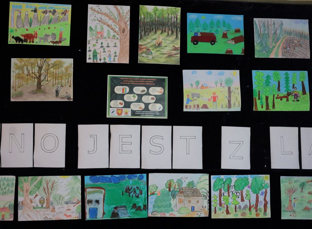 Od połowy października placówka realizuje projekt edukacyjny „Drewno jest z lasu”. Podejmowane działania, w tym konkurs plastyczny, mają na celu zwrócenie uwagi uczniów na różnorodność i bogactwo lasów w Polsce, a także uświadomienie dzieci i młodzieży, w jaki sposób można korzystać z dobrodziejstw lasu.